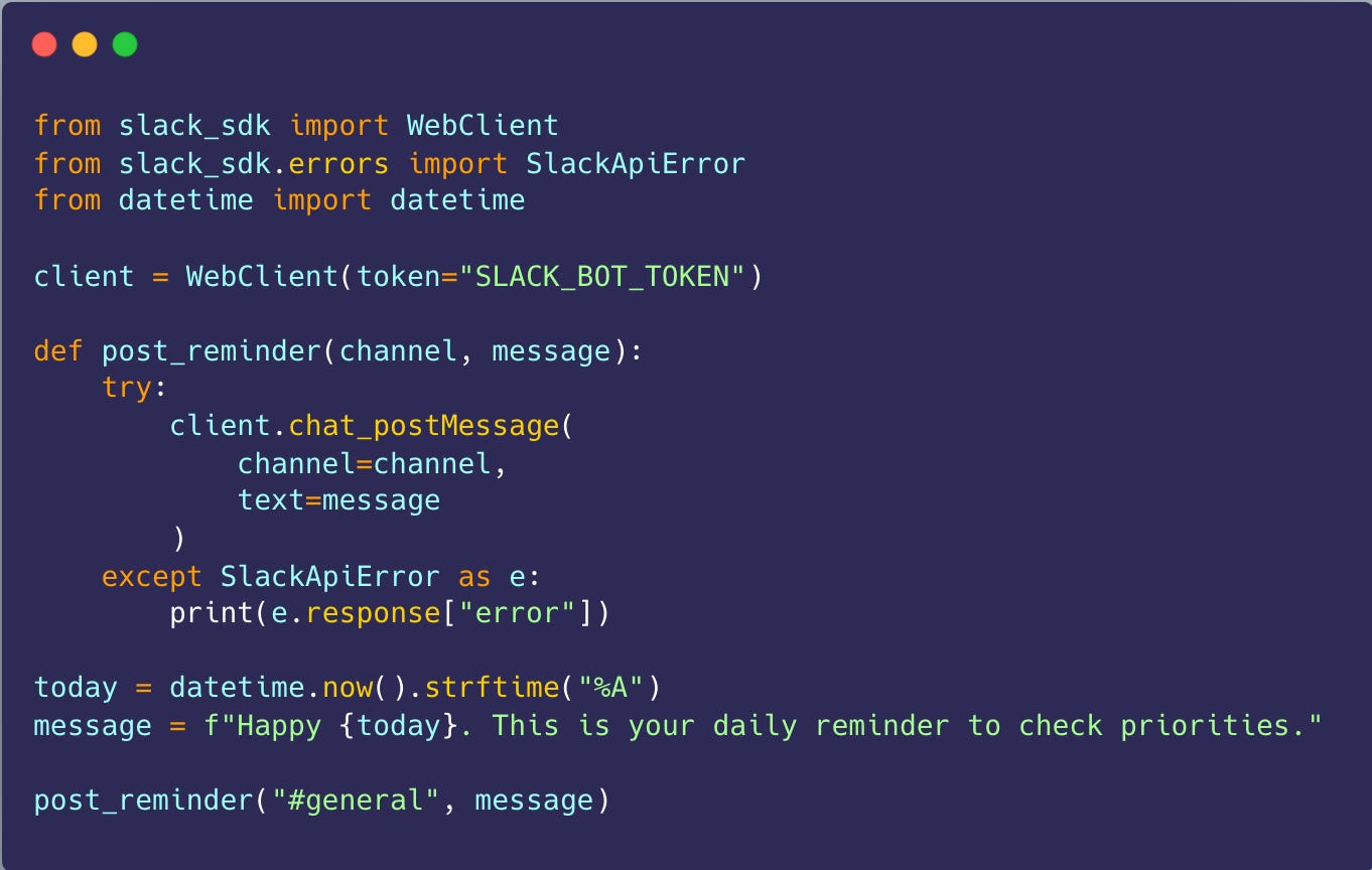 On its own, this is pretty basic. But once you add scheduling, a config file, and a little logic, it gets powerful fast. You can rotate reminders, pull tasks from a spreadsheet or database, or change what it says based on the day and time.