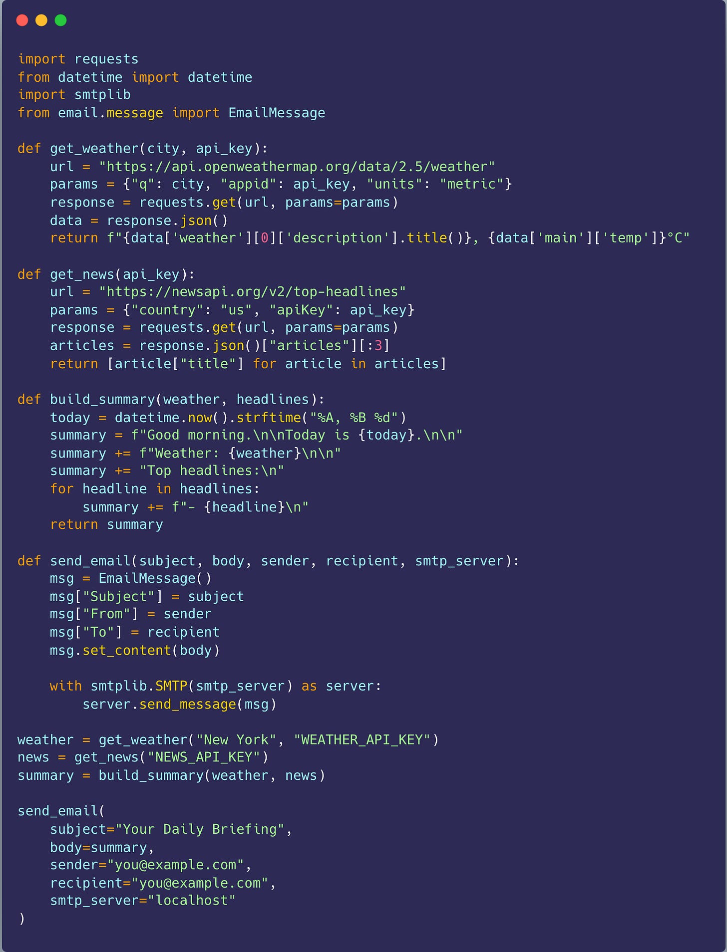 Instead of you pulling the information piece by piece, Python gathers it for you and delivers a single summary at the same time every day. You can think of it like a daily briefing from an assistant who already knows what matters to you.