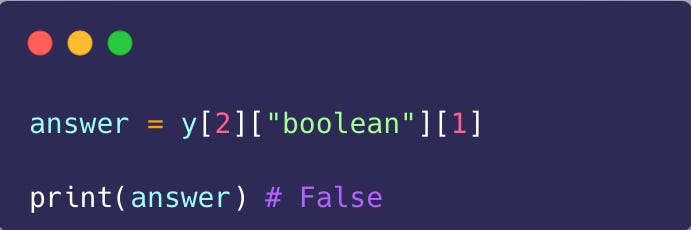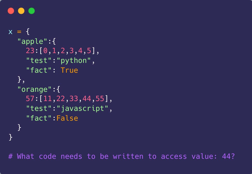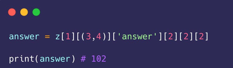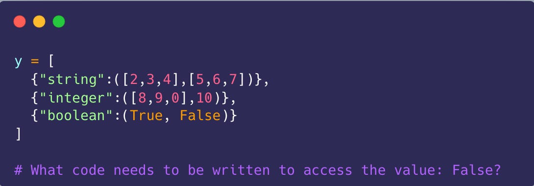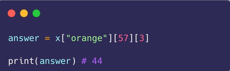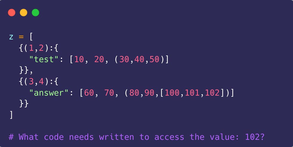 Okay, now this is a fun activity I do with my students in the classroom. I often get carried away and write a long nested data structure on the board. I want you to analyze the code and write down the correct code to access the value I ask.