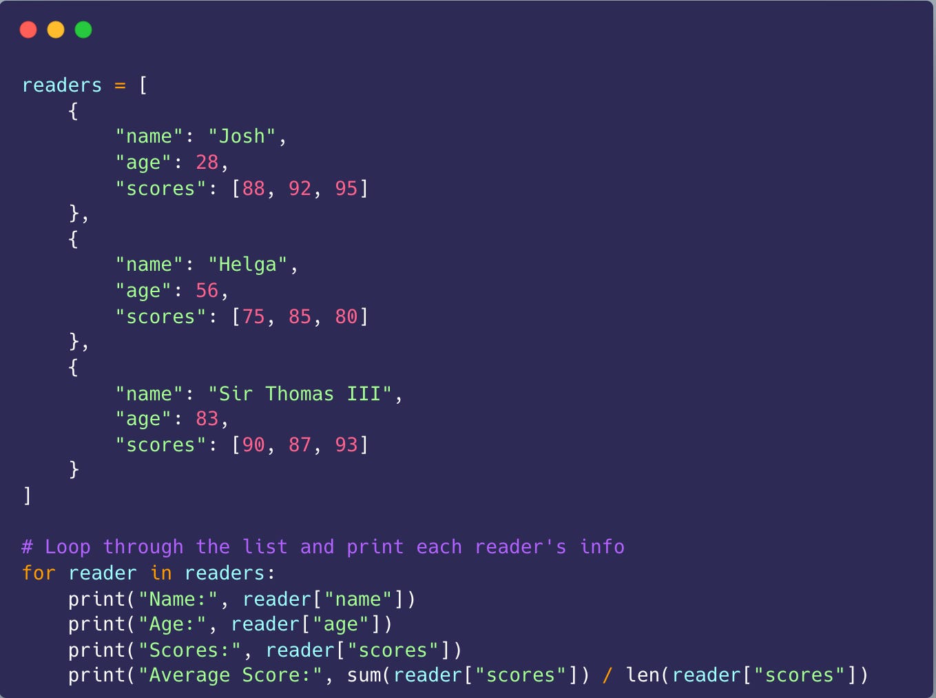 Let’s break it down with a simple example. Imagine you’re keeping track of students in a class. You might create a list where each student is stored as a dictionary. That dictionary could have keys like "name", "age", and "scores", and the value for "scores" might be a list of numbers.