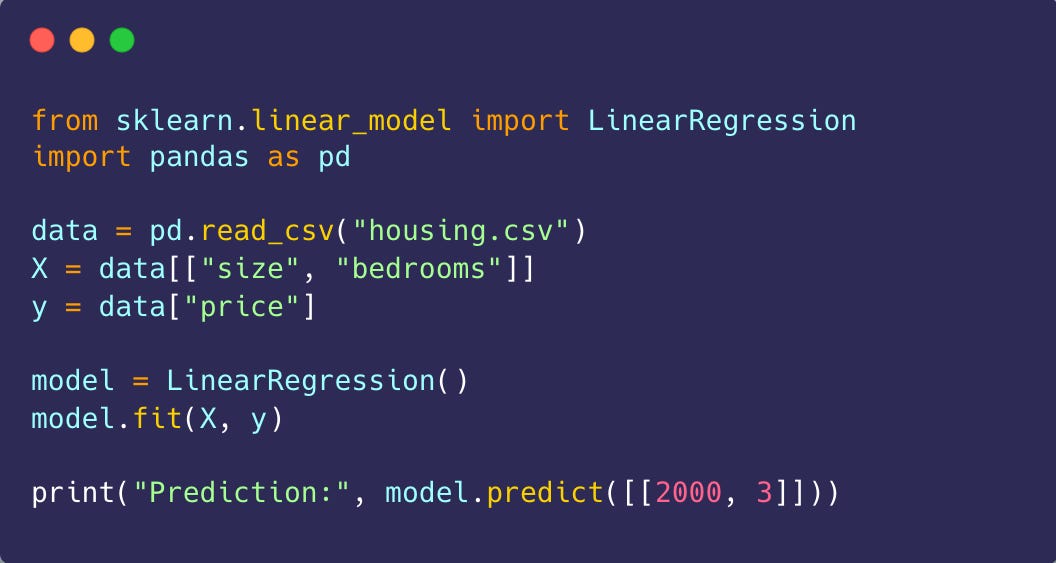 In just a few lines of code, you’re teaching the computer: “Here are some houses, their sizes, number of bedrooms, and what they sold for. Learn the relationship between those things.