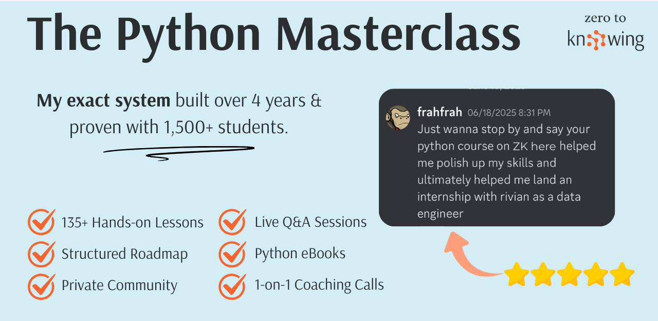 Zero to Knowing: My Python Masterclass Subscription gives you everything you need to go from zero to building real-world projects — with new lessons, challenges, and support every month. Over 1,500+ students have already used this exact system to learn faster, stay motivated, and actually finish what they start.