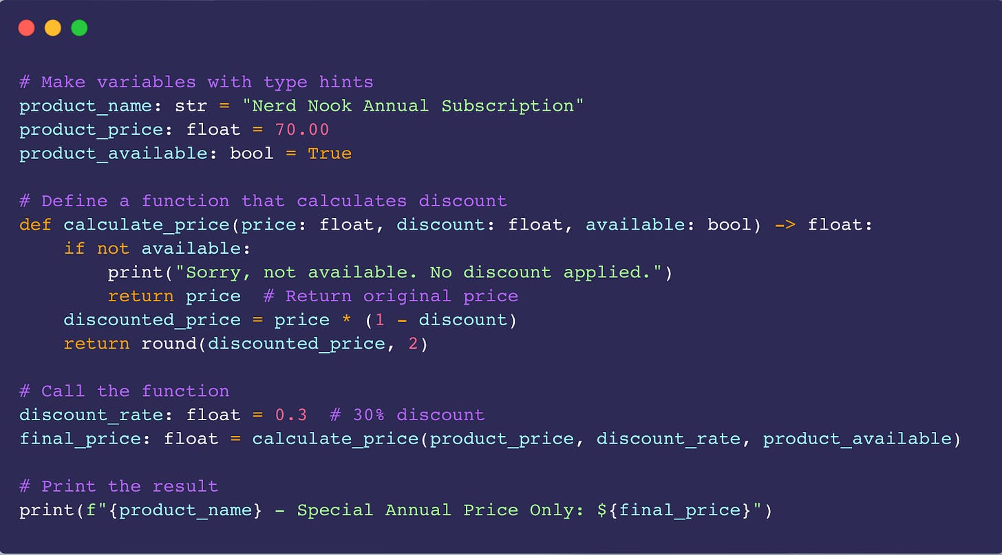 Functions aren’t just about cutting down on repetitive code. They help you keep your code clean, organized, and reusable. Every function you write should do one specific thing. When you add type hints, you make your code easier for you and anyone else reading it to understand.