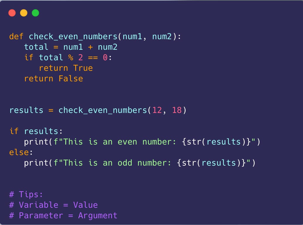 Above you can see I defined my own function, check_even_numbers. I then gave this two parameters, num1 and num2. Currently these parameters have no value, but we can write the function as if they already do, think ahead.